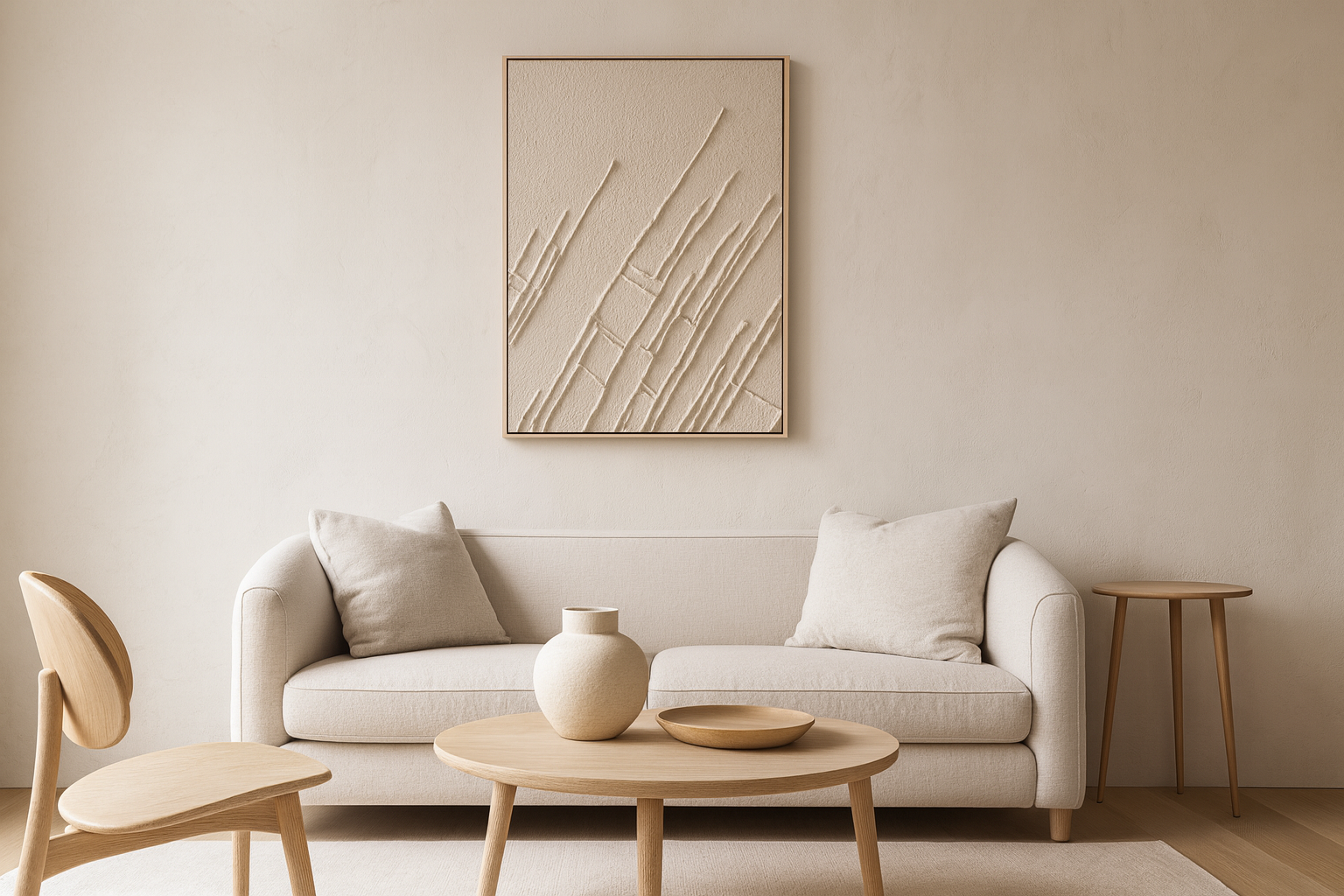 The formats in the collection are created to complement wide walls and open interiors. Large canvases form clear accents and support a smooth spatial flow. The soft lines integrate well with spacious layouts, adding depth without overwhelming the room. Relief elements enhance the natural atmosphere and bring a gentle sculptural presence.